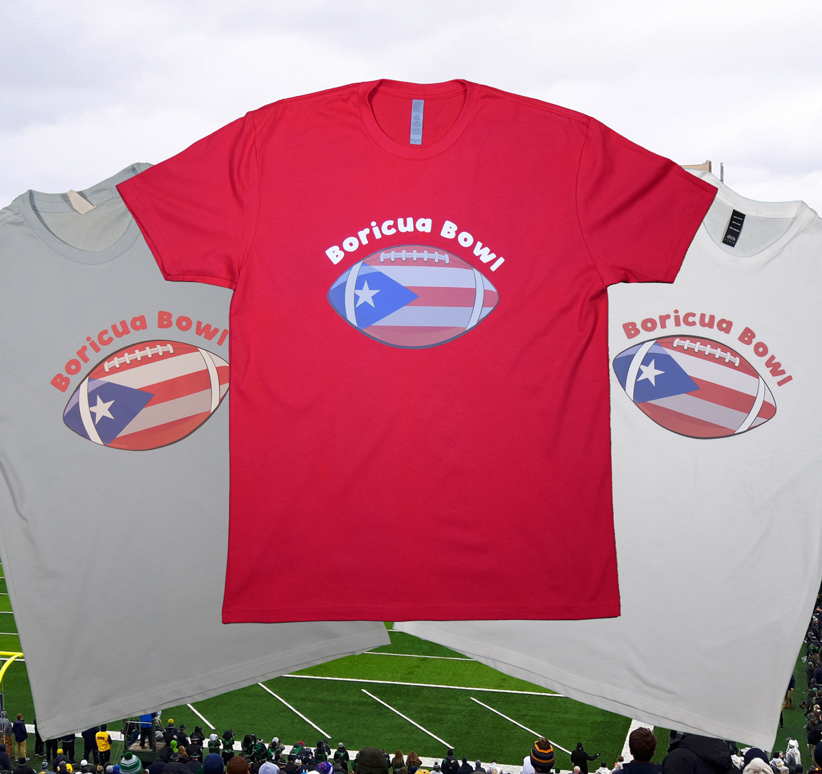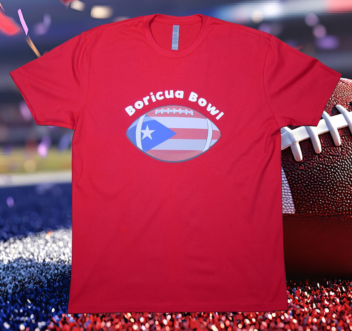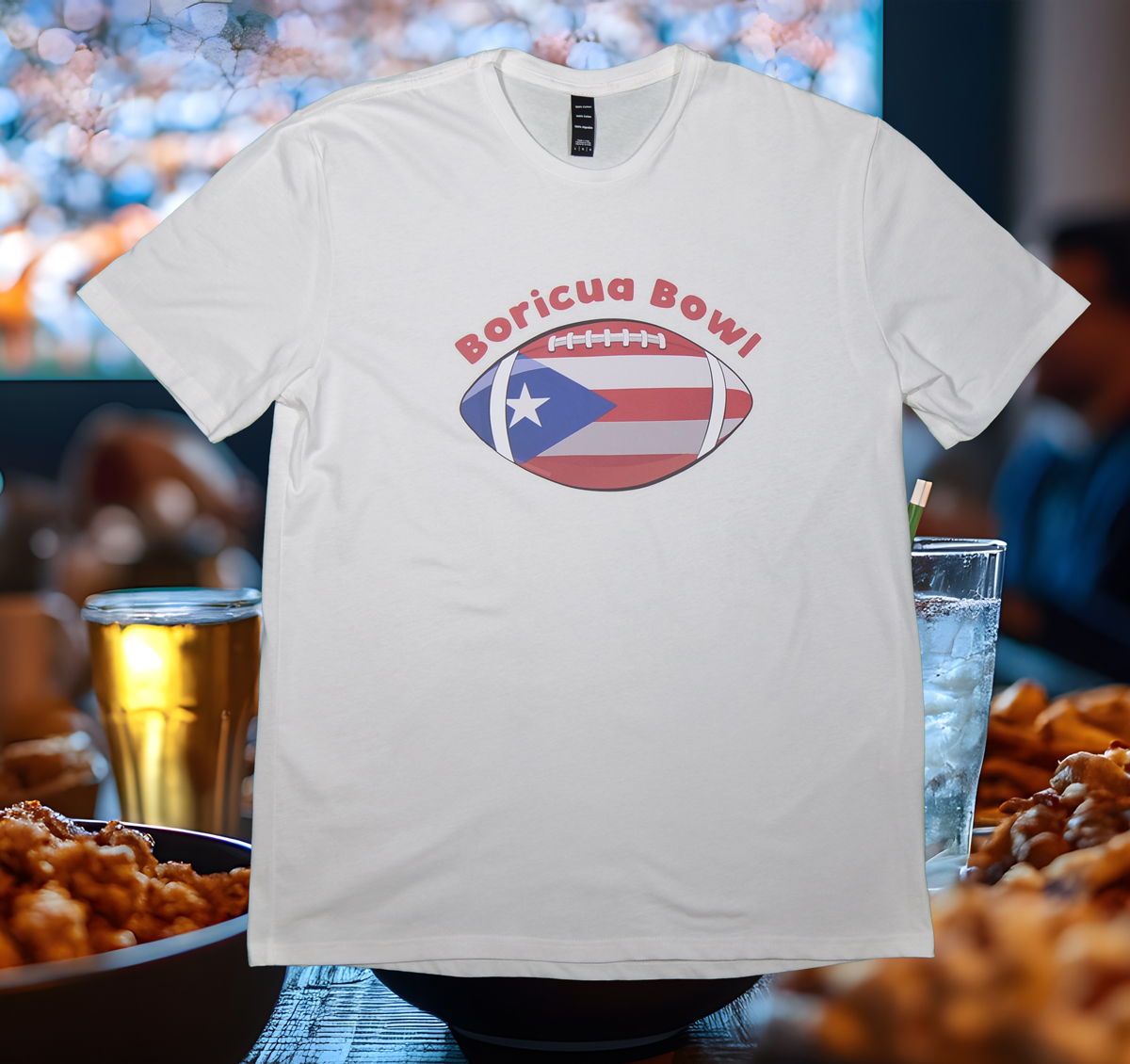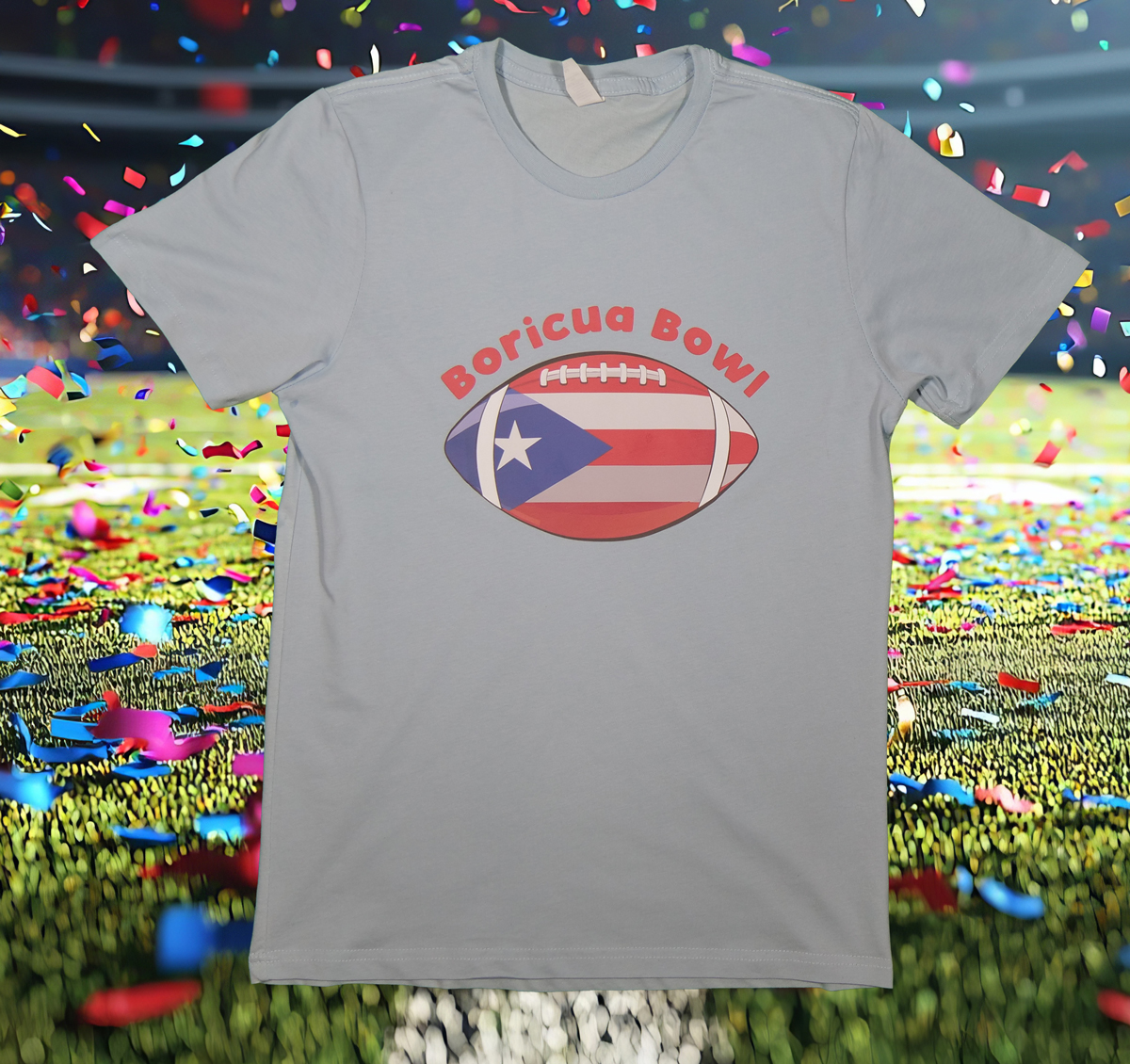 Boricua bowl football tee. This graphic tee features a football filled with the Puerto Rico flag, with Boricua Bowl arched above. It’s a bold, game-day celebration of Boricua pride—made to rep Puerto Rico loud in the football world.